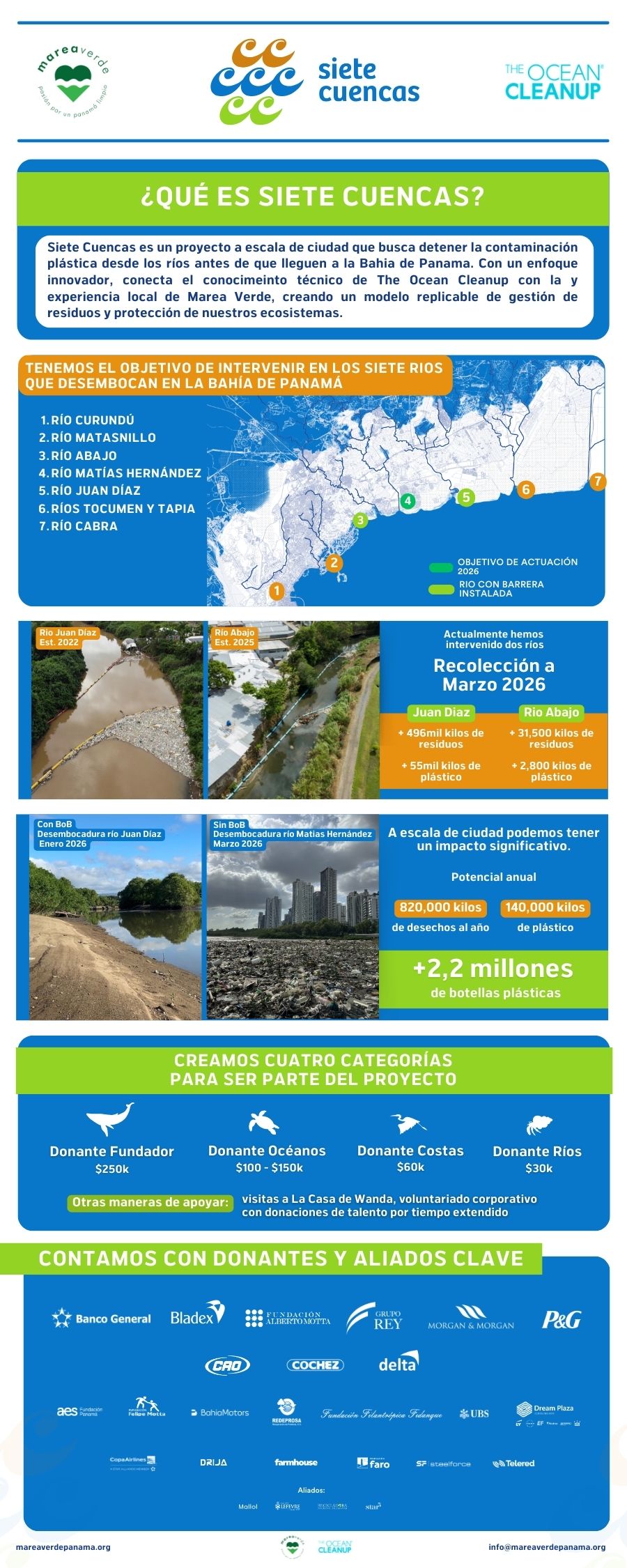 Siete Cuencas es una alianza entre Marea Verde Panamá y la organización internacional The Ocean Cleanup, reconocida por su labor global en la eliminación de plásticos en ríos y océanos.